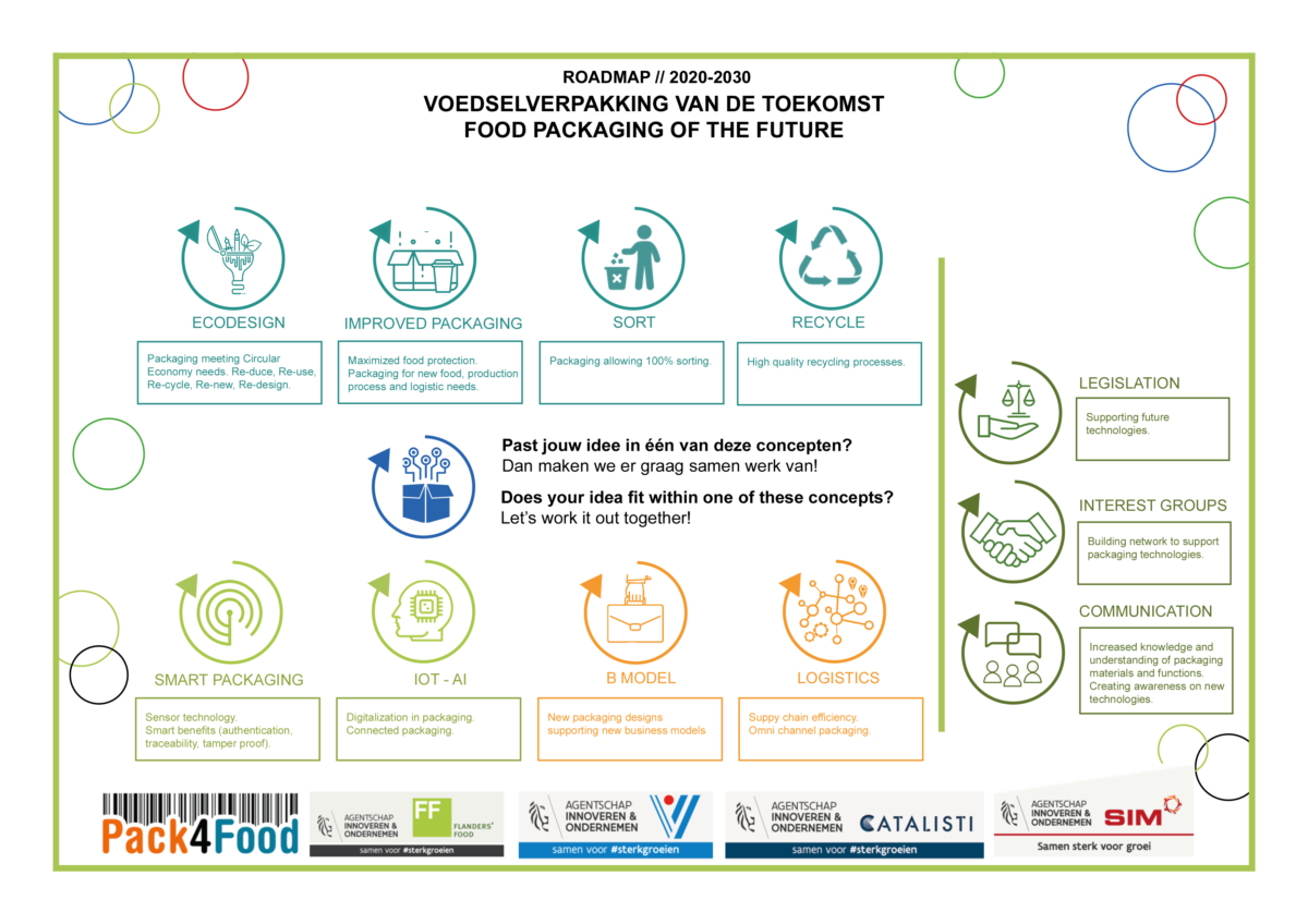 The Roadmap describes clearly defined research lines to tackle identified technological, legal and/or economical barriers and shortcomings and have companies realise the wanted innovations. The Roadmap consists both innovative trajectories as possibilities for collaborations on short, medium and long term. This offers the Flemish companies from the involved clusters perspective to strengthen their competitive clout and fulfill and internationally driven pioneering role in the cross chain and crosssectoral approach of food packaging across the Flemish borders. The innovation trajectories are divided in four themes:- Circular packaging